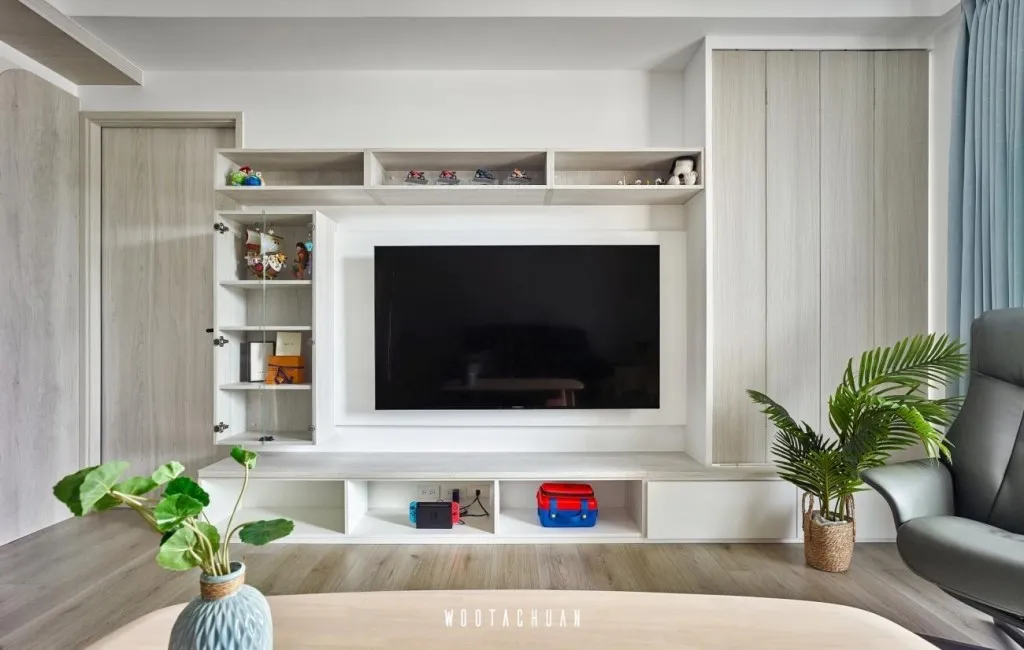 電視牆結合收納櫃與展示架,避免雜物散落;沙發下方可設抽屜。